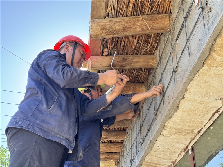 工人正在对房屋进行墙面加固。 张鑫源摄