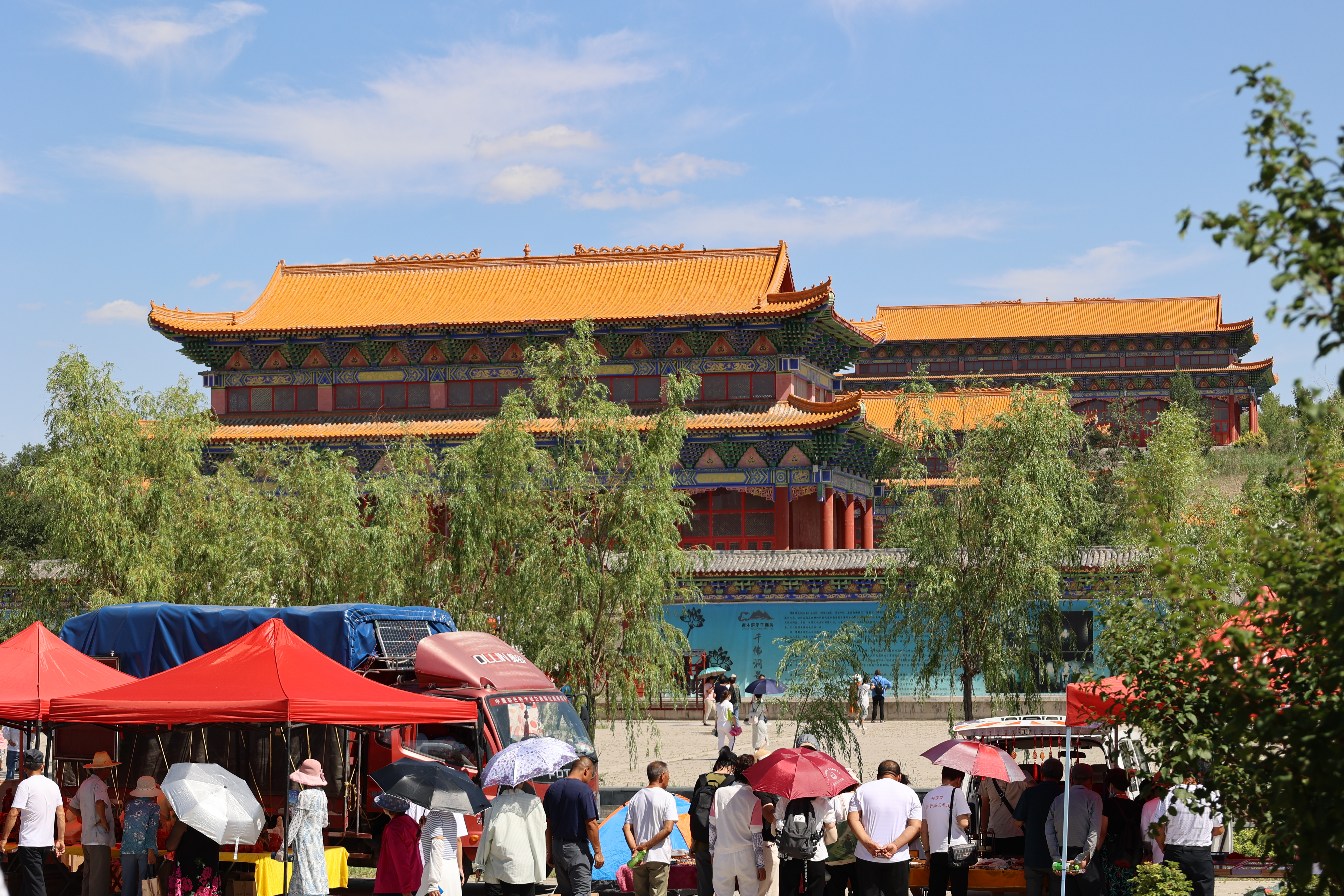 在吉木萨尔县千佛洞旅游景区,游客近距离欣赏精美建筑,通过赏民俗、品美食、购特产、听戏曲等方式,休闲观光,感受厚重的北庭历史文化。