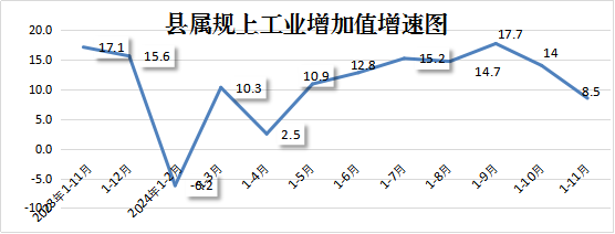 (一)工业经济增速放缓,电力、热力、燃气及水生产拉动明显。1-11月,县属39家规模以上工业企业工业总产值与上年同期持平,增加值同比增长8.5%,较1-10月增速下降5.5个百分点。规上工业涉及的六大产业集群工业增加值占规上工业的72.9%,增加值同比增长3.4%,呈“4升2降”态势。