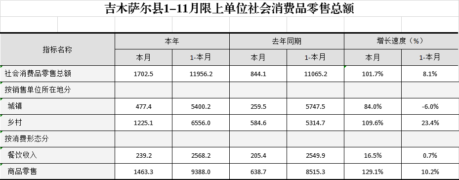 (三)县属消费市场持续增长,以旧换新相关商品销售较好。1-11月,实现限额以上社会消费品零售总额4.59亿元,占全州限额社会消费品零售总额的5%,同比增长6.9%,高于全州增速8.6个百分点,总量排名第5,增速排名第6。限上单位社会消费品零售总额1.2亿元,同比增长8.1%。(其中:分配新华书店、中石油零售总额3.39亿元,同比增长6.5%,拉动社会消费品零售总额4.9个百分点)。