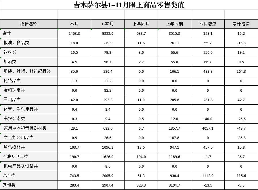 限额以上零售业稳步增长。1-11月,县属限上单位零售业实现零售额9388万元,同比增长10.2%,11月当月实现零售额1463.3万元,环比增长33%。从限额以上零售业分类情况来看,限额以上零售业涉及的汽车类和石油及制品类对零售额产生拉动作用,分别拉动限上单位商品零售总额12.6个百分点、3.9个百分点。