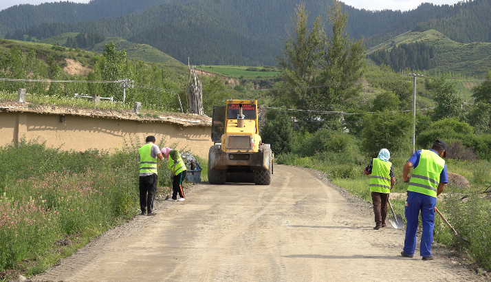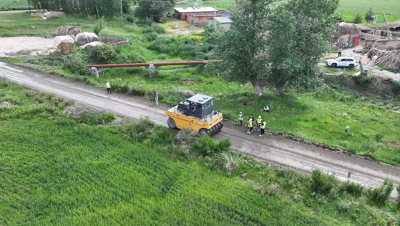 日前,在吉木萨尔县泉子街镇上九户村到北京油鸡养殖场路段,多辆大型机械车辆正往返有序、来回碾压;村民们分工合作,不时挑拣路面凸起的石块,一条平整的农村公路初见雏形。